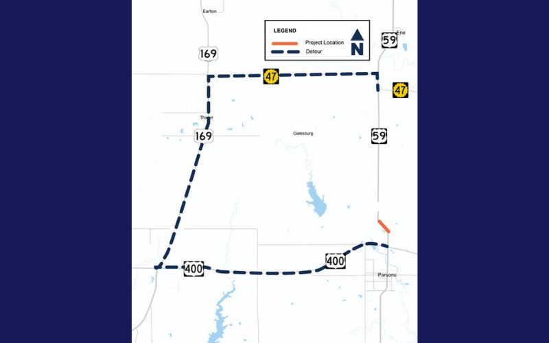 The official detour will take northbound U.S. 59 traffic west on U.S. 400, north on U.S. 169 and east on K-47 to reconnect with U.S. 59. The inverse route will take southbound U.S. 59 traffic around the work zone.
