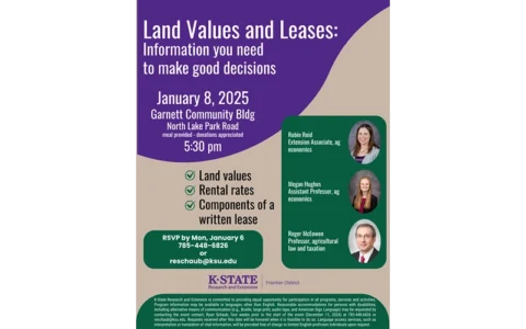 GARNETT, Kan. — The Frontier Extension District will host a public meeting on Jan. 8, 2025, to discuss current land values and the components of good written lease agreements. The meeting will be held at the Garnett Community Building, North Lake Road in Garnett, starting with a meal at 5:30 p.m. RSVPs are requested and can be made with the Frontier Extension District Garnett office by calling 785-448-6826 or emailing Ryan Schaub at [email protected] by Monday, Jan. 6.