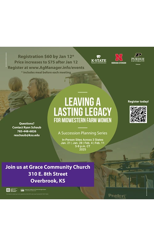 “Leaving a Lasting Legacy for Midwestern Farm Women: A Succession Planning Series,” will be held from 5:00 p.m. to 8:00 p.m. on Jan. 21, Jan. 28, Feb. 4 and Feb. 11, at Grace Community Church in Overbrook.