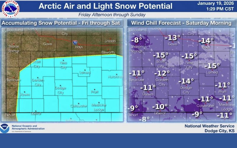 Extreme cold temperatures and dangerous wind chills will likely impact Kansas this weekend. The National Weather Service says an arctic air mass is forecast to move into the area Thursday night, with this air to stick around into next week.