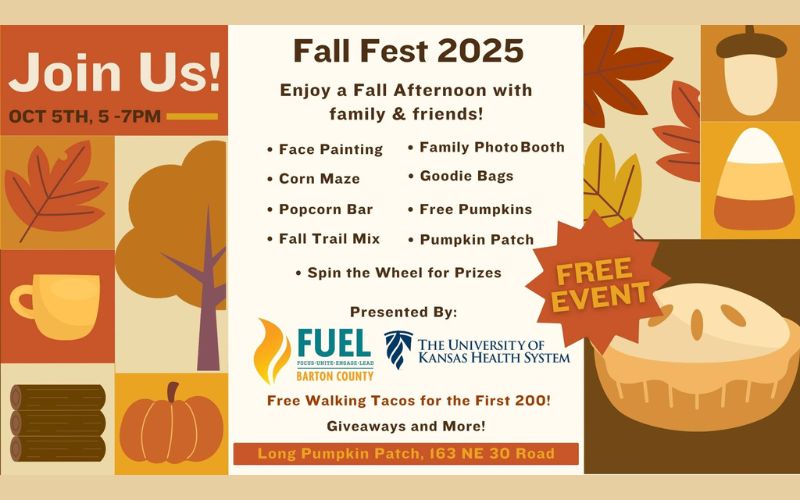 GREAT BEND, Kan. — FUEL Barton County, in partnership with The University of Kansas Health System, is excited to announce the return of Fall Fest 2025, a beloved community celebration that brings families together for an evening of autumn fun and activities.