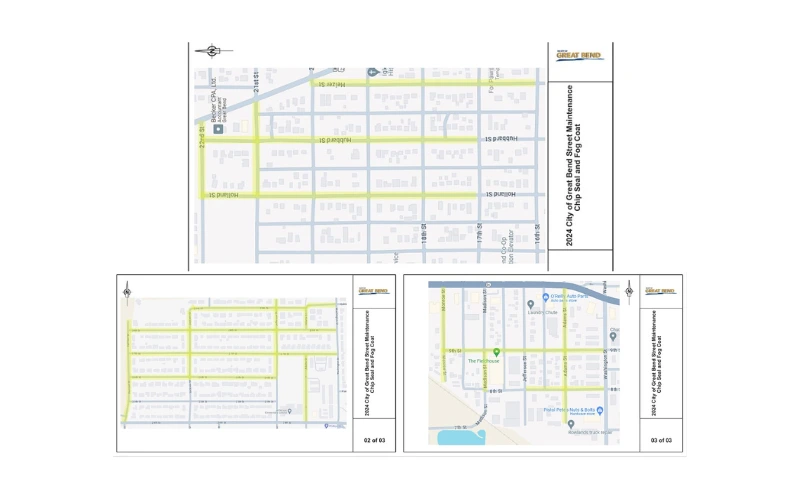 GREAT BEND, Kan. — The 2024 Chip and Seal with a Fog coat project is scheduled to begin Tuesday Sept. 3, 2024, circumstances pending. The areas to be affected by this project are select streets North of 24th between Washington and Harrison, between 281 bypass and Holland- 16th to 21st, 10th to 8th between Washington to Madison. Again, these will be selected streets that have been assessed to benefit the most from this style of maintenance.
