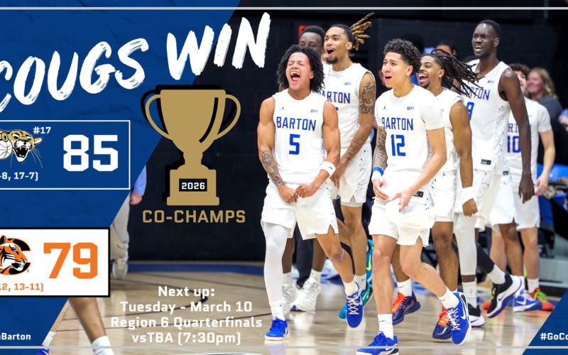 By virtue of tiebreakers, including a 5-1 record against the other top-four teams in the standings, Barton claims the top seed in the Region 6 playoffs and earns a first-round bye. The Cougars will next take the floor Tuesday night at 7:30 p.m. inside Fleske Fieldhouse against the winner of the Cloud County–Garden City first-round matchup. Quarterfinal winners advance to Great Bend as Barton hosts both the semifinal and championship rounds beginning Friday, March 13.