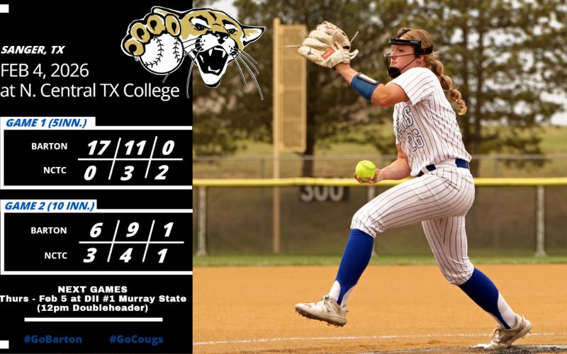 The Barton Community College softball team opened its 2026 season today in Sanger, Texas, completing a doubleheader sweep of North Central Texas College with a 17–0, five-inning victory in the opener before grinding out a 6–3 win in ten innings in the nightcap.