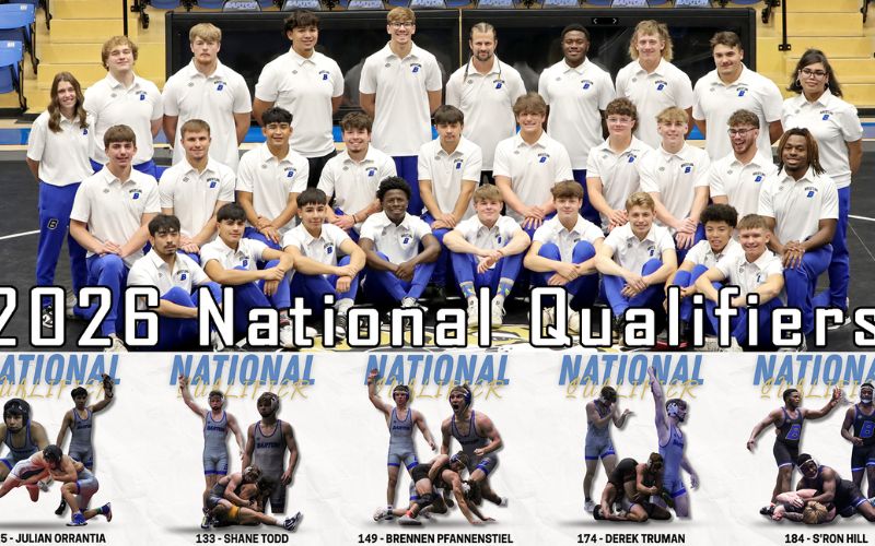 Four Barton wrestlers secured automatic bids led by S’Ron Hill (184 pounds), who finished runner-up to headline Barton’s four automatic qualifiers. Brennen Pfannenstiel (149) added a sixth-place finish, while Shane Todd (133) and Derek Truman (174) each secured seventh-place finishes to earn automatic bids. Joining the group at nationals will be Julian Orrantia (125), who received one of the district’s nine wildcard selections.