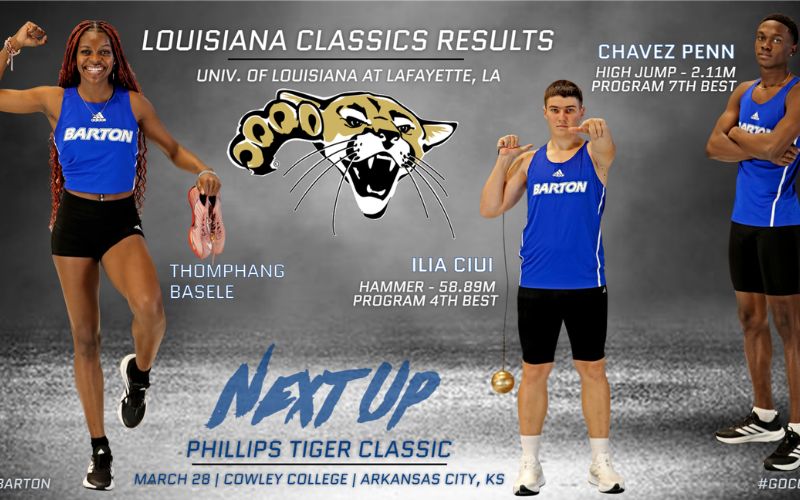 Barton will continue its outdoor schedule next Saturday, with a limited squad competing at the Mark A. Phillips Tiger Classic hosted at the Phillips Track and Field Complex in Arkansas City, Kansas, with events scheduled to begin at 11:00 a.m.