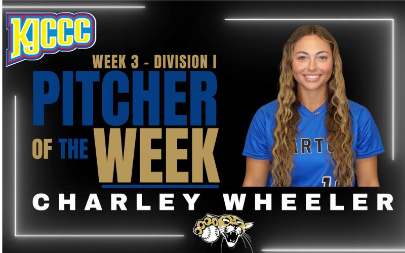 Freshman Charley Wheeler of the Barton Community College softball team has been named the Week 3 Kansas Jayhawk Community College Conference (KJCCC) Pitcher of the Week following her work in the circle during the Cougars’ 1-1 week of competition.