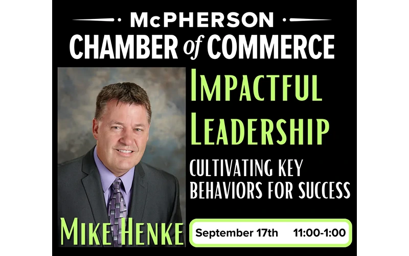 McPHERSON, Kan. — Join the McPherson Chamber of Commerce Tuesday, Sept. 17 from 11 a.m. to 1 p.m. at Hutchinson Community College (McPherson Campus) 2208 Plaza East, McPherson for a compelling workshop with speaker Mike Henke that includes