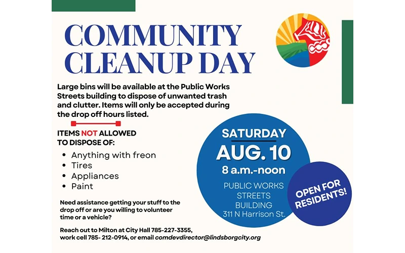 LINDSBORG, Kan. — If you missed the first Community Cleanup Day in May, don’t fret because it returns on Aug. 10. Gather your unwanted trash and clutter for drop off at the Public Works Streets building on 311 N Harrison St.