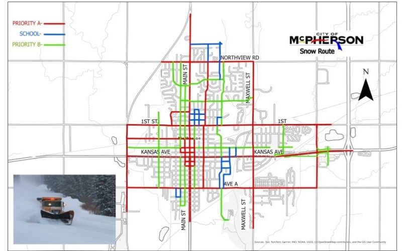 Priorities for snow plowing are also set out, with the highest priority given to the “mile line” roads such as Main, Maxwell, Centennial, Northview, First and Avenue A along with Kansas Avenue, Oak Street, Grimes from first to Northview, Hospital Drive and West 4th leading to McPherson Center for Health, Woodside west of Ash, and the central business district.