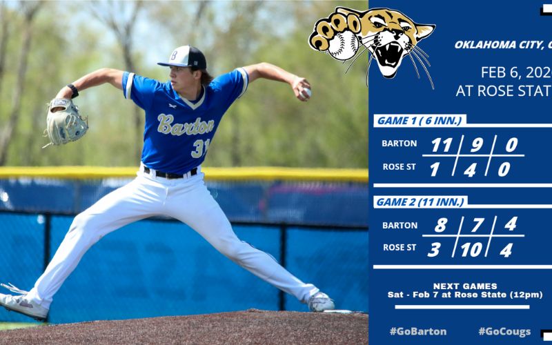 The Barton Community College baseball team delivered an Opening Day sweep Friday afternoon over Rose State College at Raider Baseball Field, rolling to an 11-1 six-inning run-rule victory in the opener before rallying for an 8-3 win in 11 innings in the nightcap.