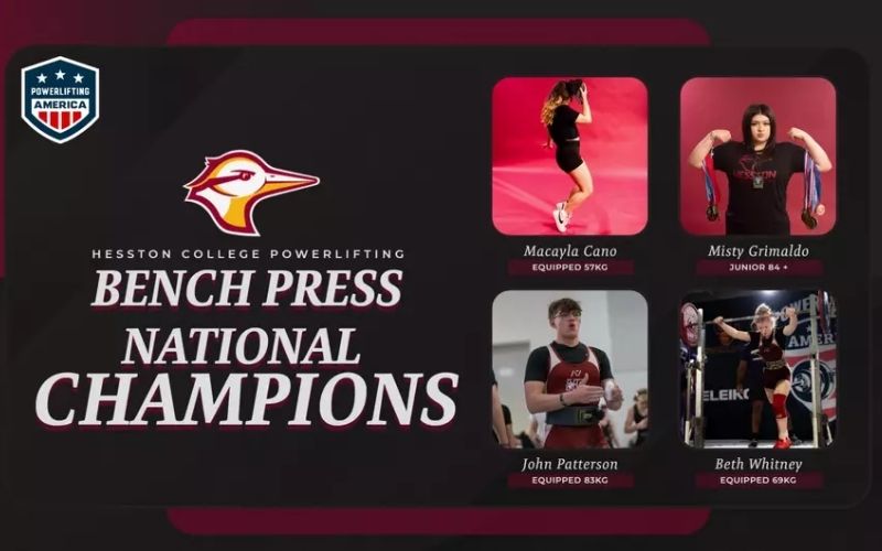 LAS VEGAS, Nev. – The Hesston College powerlifting team added four gold medals to their collection over the weekend at Powerlifting America Bench Press Nationals. Beth Whitney (Maize, Kan.), Macayla Cano (Orange Grove, Texas), Misty Grimaldo (Wichita, Kan.) and John Patterson (Newton, Kan.) each posted the top mark in their respective weight classes to emerge as national champions, qualifying for the World Bench Press team.