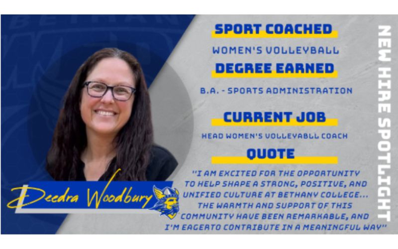 “We are thrilled to welcome Deedra Woodbury as our Head Volleyball Coach. She is a tremendous fit for Bethany College and our Department of Athletics,” said Dean of Athletics Laura Moreno. “Her passion for building, competing, and developing young women into leaders aligns with our mission and vision for the program.”