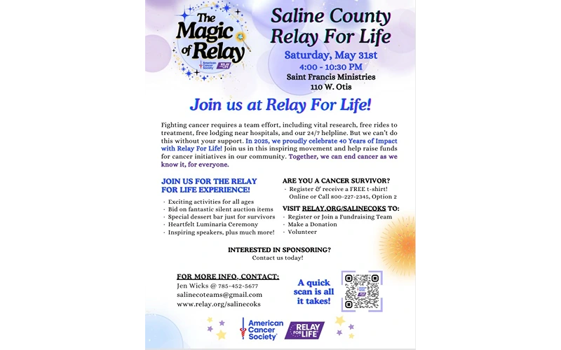 SALINA, Kan. — The American Cancer Society is getting ready for the 2025 Relay For Life of Saline County on Saturday, May 31 from 4 p.m. to 10:30 p.m. at a new location: Saint Francis Ministries, 110 W. Otis in North Salina.This year's theme... Read More.