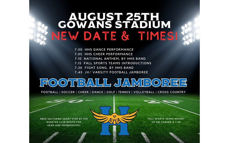 By Hutchinson Public Schools HUTCHINSON, Kan.  — Thursday night's Blue/Gold Night is canceled due to the heat. There will be a modified schedule for Friday at Gowan's Stadium. Friday's Football Jamboree Schedule:7:00 PM Hutch High Dance Team Performance7:05 PM Hutch High Cheer Performance7:10 PM National Anthem,... Read More.