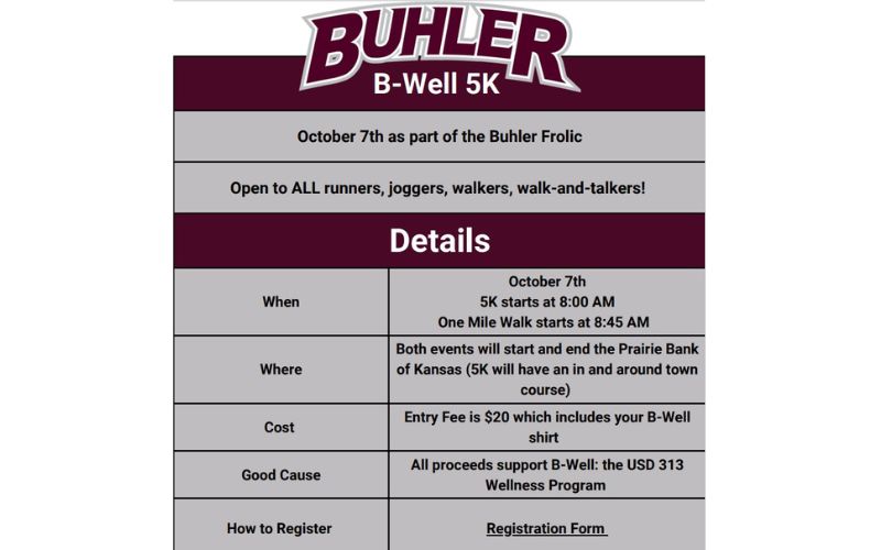 BUHLER, Kan. — As part of the Buhler Frolic, USD 313 will host a 5K! The event will be on the morning of September 27th, 2025. While competitive runners are welcome, the course is designed for runners, joggers, and walkers. It's an untimed event,... Read More.