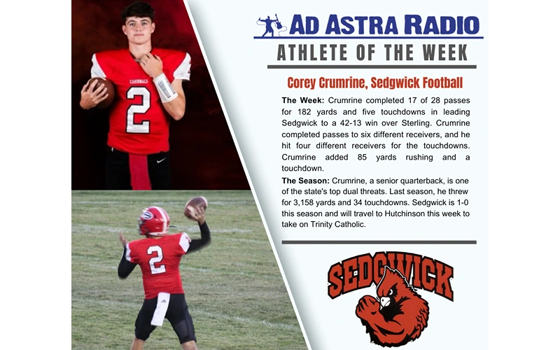 SEDGWICK, Kan. — Starting this week, Ad Astra Radio will be recognizing outstanding athletes from high schools we cover. Our first Athlete of the Week is Senior Quarterback Corey Crumrine from Sedgwick High School!The week: Crumrine completed 17 of 28 passes for 182... Read More.