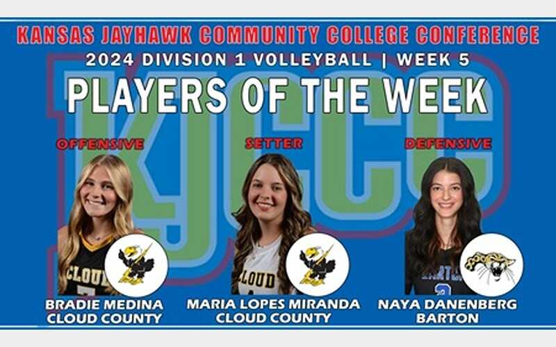 COLBY, Kan. (KJCCC.org) - A trio of fresh faces highlight this week’s Kansas Jayhawk Community College Conference Division 1 Volleyball Player of the Week Awards with Cloud County’s Bradie Medina (offensive), Maria Lopes Miranda (setter) and Barton’s Naya Danenberg (defensive) earning week five honors... Read More.