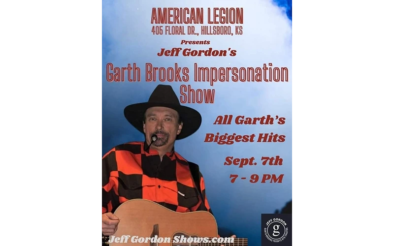By Brenna Eller HILLSBORO, Kan. — The American Legion Post 366 in Hillsboro, Kan., will host national touring act Jeff Gordon, for his Garth Brooks Tribute show "The Thunder Rolls" on Saturday, Sept. 7, from 7 to 9 p.m. Advance tickets are available for $20.... Read More.