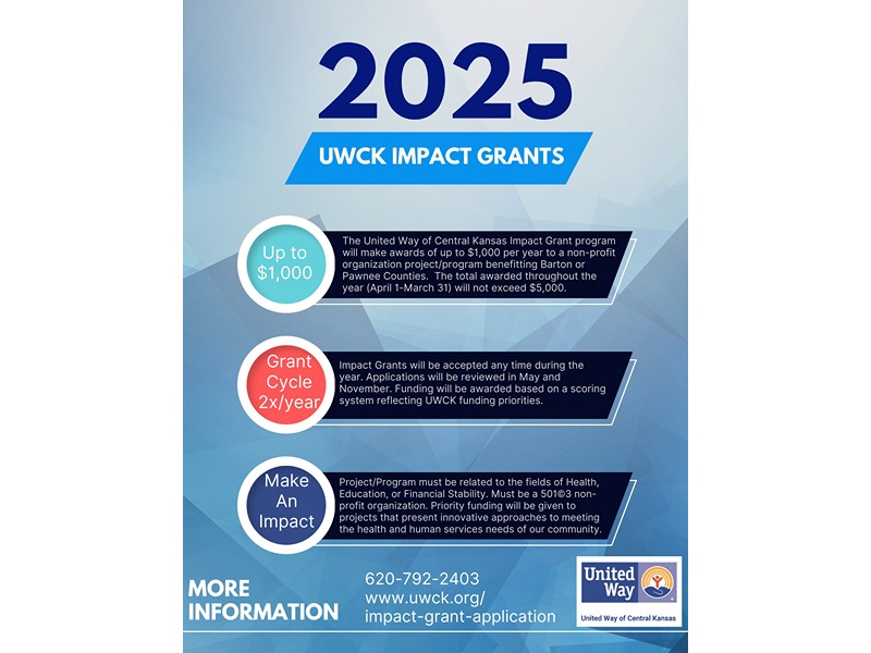 The United Way of Central Kansas (UWCK) Impact Grant Applications are officially open! If your organization is doing impactful work in Health, Education, or Financial Stability, apply today!Application process: Simple one-page application, Funds awarded in May, Total annual funding: $5,000Apply now  Read More.