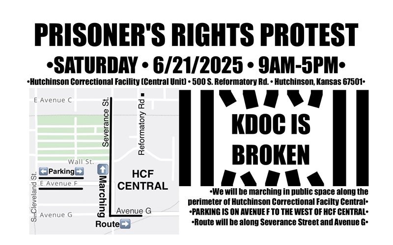 Location: Hutchinson Correctional Facility (Central Unit)  500 S. Reformatory Rd. Hutchinson, Kansas 67501What: INMATES RIGHTS PROTESTWhen: Saturday, June 21, 2025, 9:00 a.m. – 5:00 p.m.Where: Avenue G/Severance, across from the prison parking lot (close to Eastside Cemetery) and the surrounding area of Central Unit... Read More.