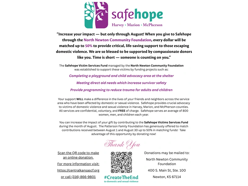 NEWTON, Kan. (August 1, 2025) — This August, your impact goes even further! Thanks to the generous support of the Patterson Family Foundation, every donation made to the Safehope Victim Services Fund will be matched up to 50 percent! That means every dollar you give... Read More.