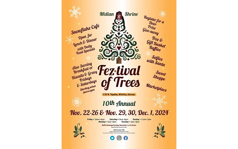 By the Midian Shrine WICHITA, Kan. — The 10th Annual Midian Shrine Fez-tival of Trees is a fantastic event to kick off the holiday season! Here's a quick rundown of what you can expect:Dates: November 22, 23, 24, 25, 26, 29, 30, & December 1. Highlights: ... Read More.