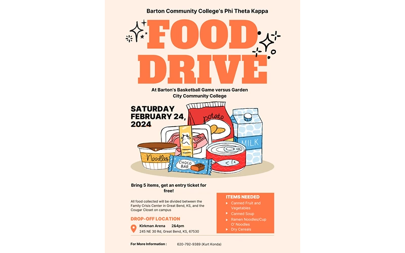 By Joe Vinduska, Barton Community College GREAT BEND, Kan. — Those wanting to help a great cause and catch some exciting basketball action will have the opportunity to do both as part of Barton’s Phi Theta Kappa Chapter’s Food Drive from 2-5:30 p.m. Feb.... Read More.