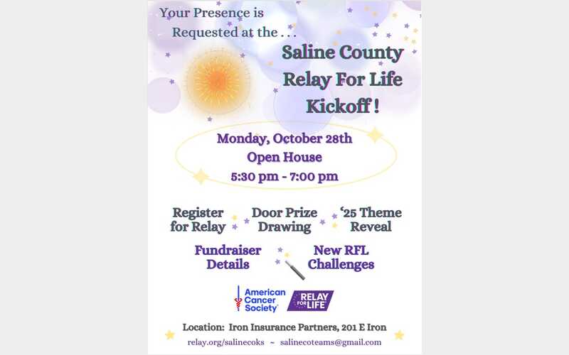 SALINA, Kan. — The American Cancer Society is getting ready for the 2025 Relay For Life of Saline County on Saturday, May 31 from 4 p.m. to 10:30 p.m. at a new location: Saint Francis Ministries, 110 W. Otis in North Salina.This year's theme... Read More.