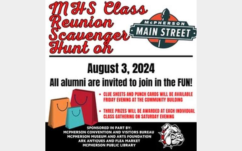 By Brenna Eller McPHERSON, Kan. — All McPherson High School Alumni are invited to join the fun on Saturday, Aug. 3 for a Scavenger Hunt on Main Street for the 2024 MHS Class Reunion!This year, the scavenger hunt includes clue sheets, punch cards and mini... Read More.