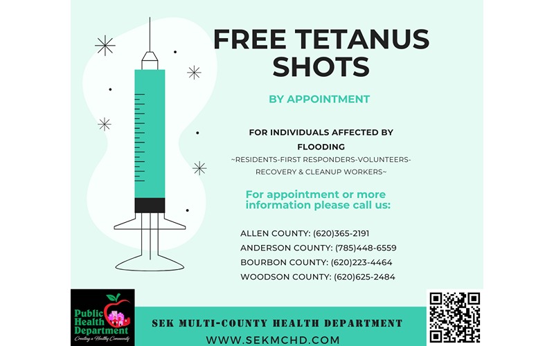 By SEK Multi-County Health Department SOUTHEAST, Kan. — SEK Multi-County Health Department is offering free tetanus shots for individuals affected by the recent flooding. Tetanus shots will be available to impacted residents as well as first responders, volunteers, or any others who have been... Read More.