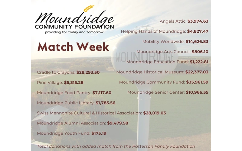 MOUNDRIDGE, Kan. — Last Tuesday, on Nov. 19 the Moundridge Community Foundation announced that a record-breaking $174,948.75 was raised during this year's Match Week thanks to the support of community donors.Today, the Foundation released the final totals from what each organization raised. The amounts... Read More.