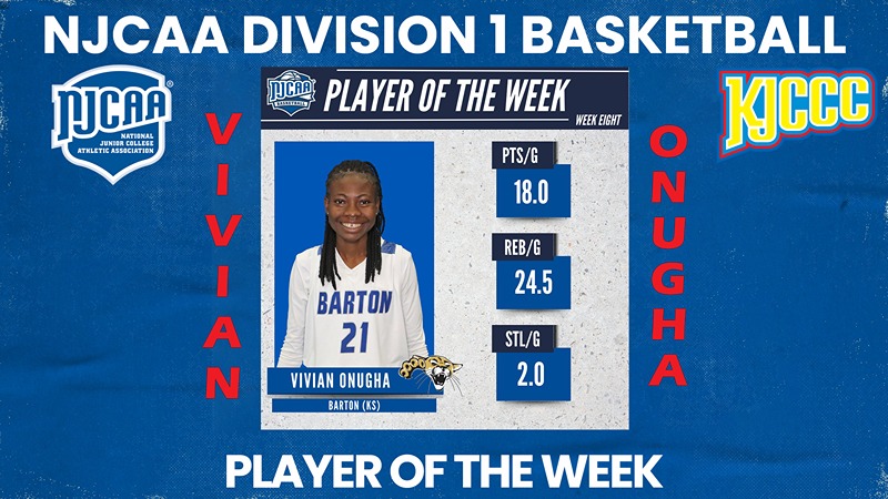 CHARLOTTE, N.C. (KJCCC.org) - Following a record-setting performance last week that led to Kansas Jayhawk Community College Conference Division 1 Women’s Basketball Player of the Week honors on Tuesday, Barton Community College sophomore Vivian Onugha has been named NJCAA Division 1 Women’s Basketball Player... Read More.